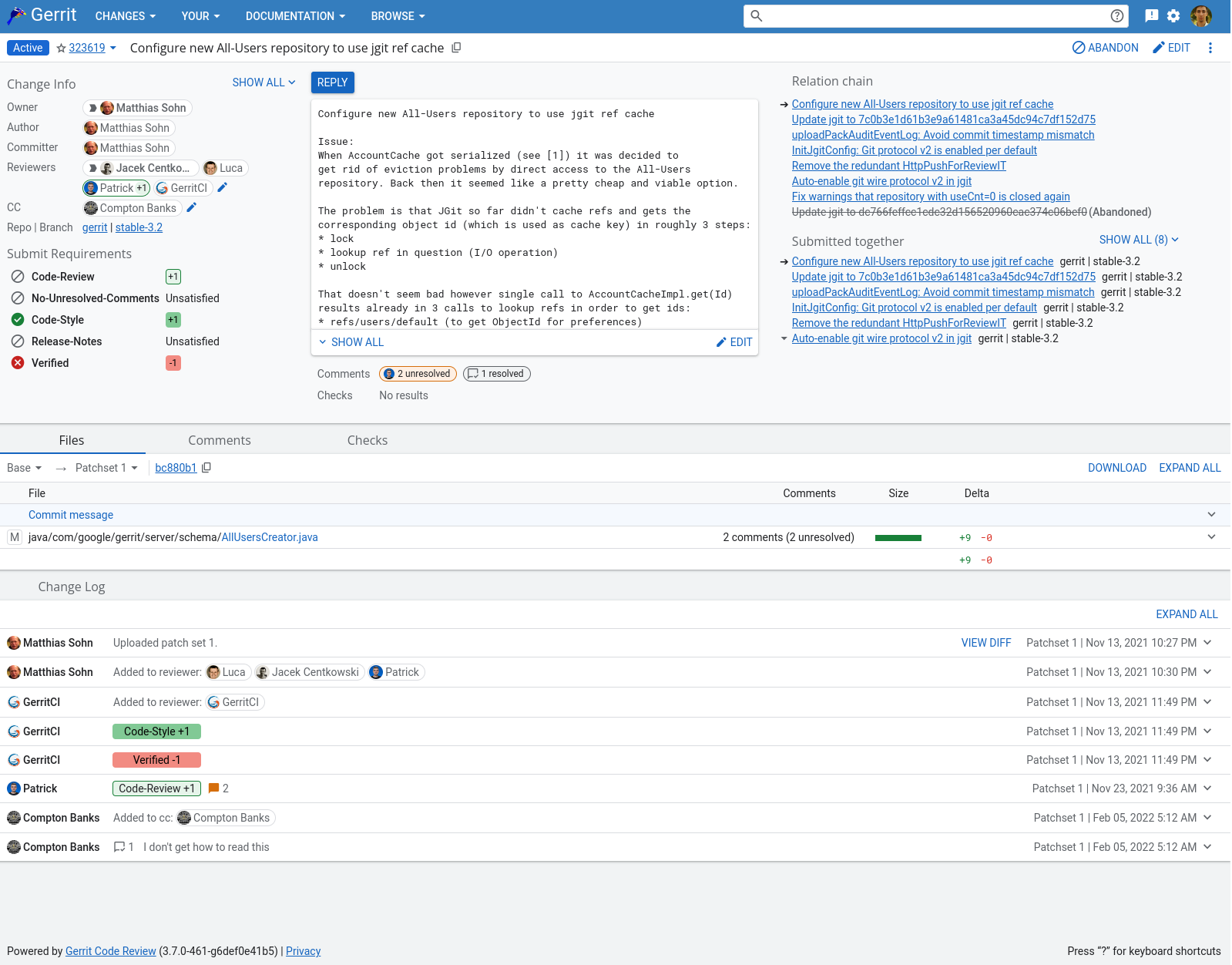 The file list shows the files that are modified in the currently viewed patch set.