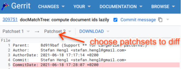 In the header, on each side, the list of patch sets is shown. Clicking on a patch set changes the selection for the patch set comparison and the screen is refreshed to show the diff between the selected patch sets. The currently selected patch set is highlighted by a light blue background.