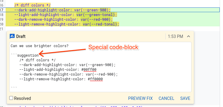 Clicking "Suggest Fix" will insert a special code-block in the text of the comment. The contents of this code block will replace the lines the comment is attached to (what gets highlighted when hovering over comment).